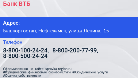 Банк ВТБ по адресу Башкортостан, Нефтекамск, улица Ленина, 15 в дальнейшем Организация, размещена в следующих категориях: