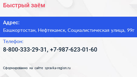 Быстрый заём по адресу Башкортостан, Нефтекамск, Социалистическая улица, 99г в дальнейшем Организация, размещена в следующих категориях: