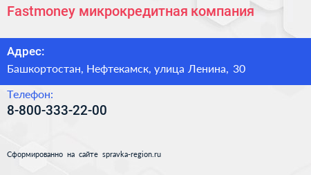 Fastmoney, микрокредитная компания по адресу Башкортостан, Нефтекамск, улица Ленина, 30 в дальнейшем Организация, размещена в следующих категориях: