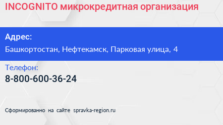 INCOGNITO, микрокредитная организация по адресу Башкортостан, Нефтекамск, Парковая улица, 4 в дальнейшем Организация, размещена в следующих категориях: