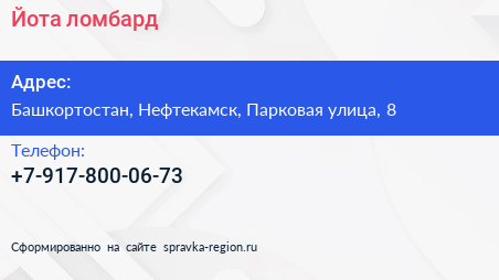 Йота, ломбард по адресу Башкортостан, Нефтекамск, Парковая улица, 8 в дальнейшем Организация, размещена в следующих категориях:
