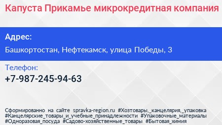 Капуста Прикамье, микрокредитная компания по адресу Башкортостан, Нефтекамск, улица Победы, 3 в дальнейшем Организация, размещена в следующих категориях:
