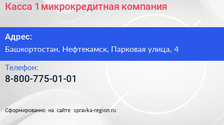 Касса №1, микрокредитная компания по адресу Башкортостан, Нефтекамск, Парковая улица, 4 в дальнейшем Организация, размещена в следующих категориях: