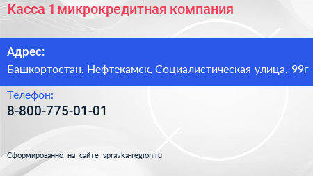 Касса №1, микрокредитная компания по адресу Башкортостан, Нефтекамск, Социалистическая улица, 99г в дальнейшем Организация, размещена в следующих категориях: