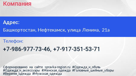 Компания по адресу Башкортостан, Нефтекамск, улица Ленина, 21а в дальнейшем Организация, размещена в следующих категориях: