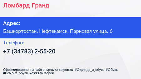 Ломбард Гранд по адресу Башкортостан, Нефтекамск, Парковая улица, 6 в дальнейшем Организация, размещена в следующих категориях: