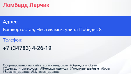 Ломбард Ларчик по адресу Башкортостан, Нефтекамск, улица Победы, 8 в дальнейшем Организация, размещена в следующих категориях: