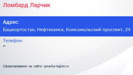 Ломбард Ларчик по адресу Башкортостан, Нефтекамск, Комсомольский проспект, 24 в дальнейшем Организация, размещена в следующих категориях:
