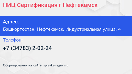 НИЦ-Сертификация, г. Нефтекамск по адресу Башкортостан, Нефтекамск, Индустриальная улица, 4 в дальнейшем Организация, размещена в следующих категориях: