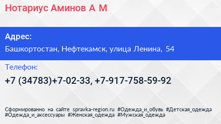 Нотариус Аминов А.М. по адресу Башкортостан, Нефтекамск, улица Ленина, 54 в дальнейшем Организация, размещена в следующих категориях: