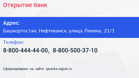 Открытие, банк по адресу Башкортостан, Нефтекамск, улица Ленина, 21/1 в дальнейшем Организация, размещена в следующих категориях:
