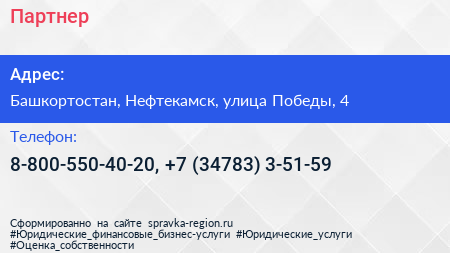 Партнер по адресу Башкортостан, Нефтекамск, улица Победы, 4 в дальнейшем Организация, размещена в следующих категориях: