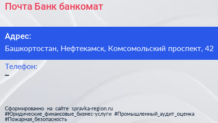 Почта Банк, банкомат по адресу Башкортостан, Нефтекамск, Комсомольский проспект, 42 в дальнейшем Организация, размещена в следующих категориях: