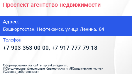 Проспект, агентство недвижимости по адресу Башкортостан, Нефтекамск, улица Ленина, 84 в дальнейшем Организация, размещена в следующих категориях: