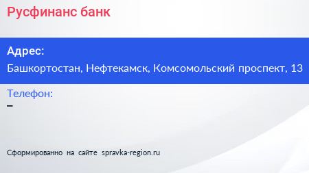 Русфинанс банк по адресу Башкортостан, Нефтекамск, Комсомольский проспект, 13 в дальнейшем Организация, размещена в следующих категориях: