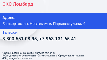 СКС Ломбард по адресу Башкортостан, Нефтекамск, Парковая улица, 4 в дальнейшем Организация, размещена в следующих категориях: