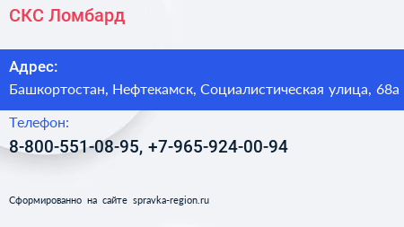 СКС Ломбард по адресу Башкортостан, Нефтекамск, Социалистическая улица, 68а в дальнейшем Организация, размещена в следующих категориях: