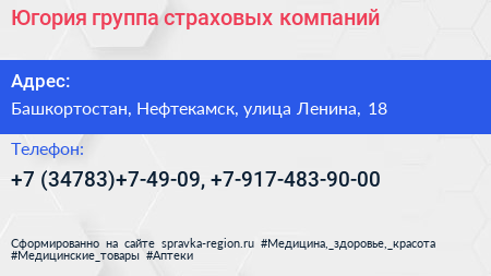 Югория, группа страховых компаний по адресу Башкортостан, Нефтекамск, улица Ленина, 18 в дальнейшем Организация, размещена в следующих категориях: