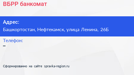 ВБРР, банкомат по адресу Башкортостан, Нефтекамск, улица Ленина, 26Б в дальнейшем Организация, размещена в следующих категориях: