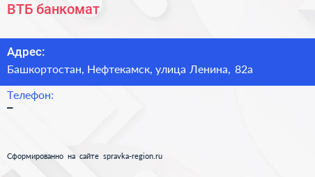 ВТБ, банкомат по адресу Башкортостан, Нефтекамск, улица Ленина, 82а в дальнейшем Организация, размещена в следующих категориях: