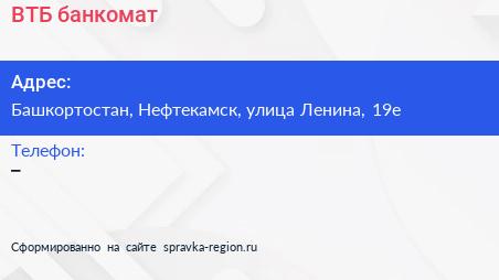 ВТБ, банкомат по адресу Башкортостан, Нефтекамск, улица Ленина, 19е в дальнейшем Организация, размещена в следующих категориях: