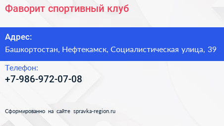 Фаворит, спортивный клуб по адресу Башкортостан, Нефтекамск, Социалистическая улица, 39 в дальнейшем Организация, размещена в следующих категориях: