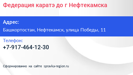 Федерация каратэ-до г. Нефтекамска по адресу Башкортостан, Нефтекамск, улица Победы, 11 в дальнейшем Организация, размещена в следующих категориях: