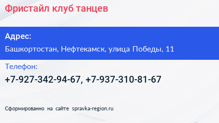 Фристайл, клуб танцев по адресу Башкортостан, Нефтекамск, улица Победы, 11 в дальнейшем Организация, размещена в следующих категориях: