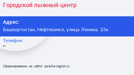 Городской лыжный центр по адресу Башкортостан, Нефтекамск, улица Ленина, 23а в дальнейшем Организация, размещена в следующих категориях: