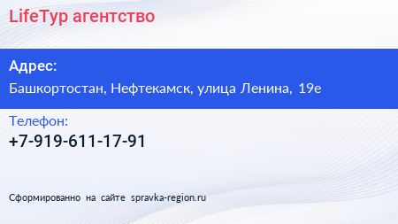 LifeТур, агентство по адресу Башкортостан, Нефтекамск, улица Ленина, 19е в дальнейшем Организация, размещена в следующих категориях: