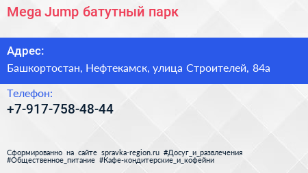 Mega Jump, батутный парк по адресу Башкортостан, Нефтекамск, улица Строителей, 84а в дальнейшем Организация, размещена в следующих категориях: