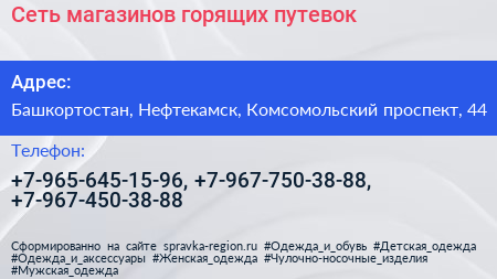 Сеть магазинов горящих путевок по адресу Башкортостан, Нефтекамск, Комсомольский проспект, 44 в дальнейшем Организация, размещена в следующих категориях: