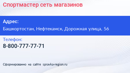 Спортмастер, сеть магазинов по адресу Башкортостан, Нефтекамск, Дорожная улица, 56 в дальнейшем Организация, размещена в следующих категориях: