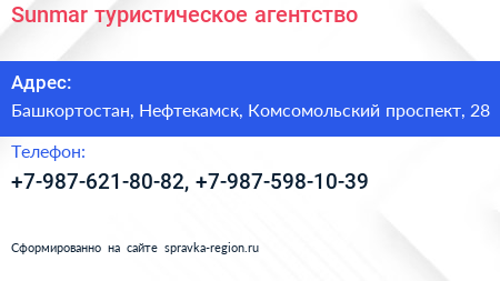 Sunmar, туристическое агентство по адресу Башкортостан, Нефтекамск, Комсомольский проспект, 28 в дальнейшем Организация, размещена в следующих категориях: