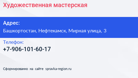 Художественная мастерская по адресу Башкортостан, Нефтекамск, Мирная улица, 3 в дальнейшем Организация, размещена в следующих категориях: