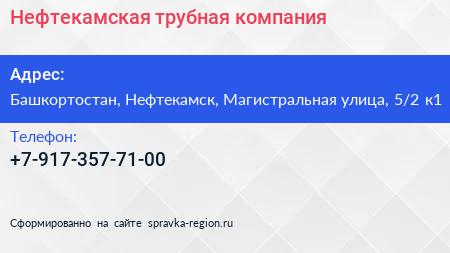 Нефтекамская трубная компания по адресу Башкортостан, Нефтекамск, Магистральная улица, 5/2 к1 в дальнейшем Организация, размещена в следующих категориях: