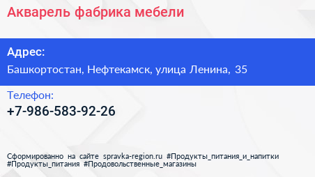 Акварель, фабрика мебели по адресу Башкортостан, Нефтекамск, улица Ленина, 35 в дальнейшем Организация, размещена в следующих категориях: