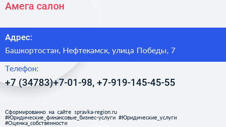 Амега, салон по адресу Башкортостан, Нефтекамск, улица Победы, 7 в дальнейшем Организация, размещена в следующих категориях: