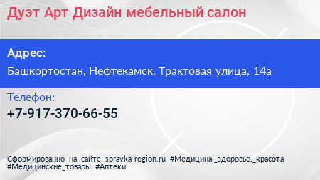 Дуэт-Арт-Дизайн, мебельный салон по адресу Башкортостан, Нефтекамск, Трактовая улица, 14а в дальнейшем Организация, размещена в следующих категориях: