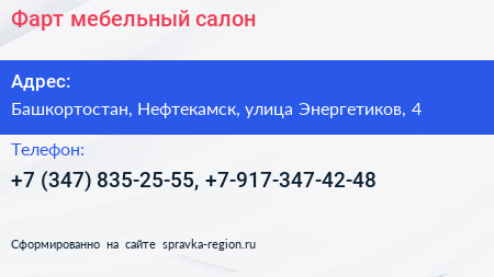 Фарт, мебельный салон по адресу Башкортостан, Нефтекамск, улица Энергетиков, 4 в дальнейшем Организация, размещена в следующих категориях: