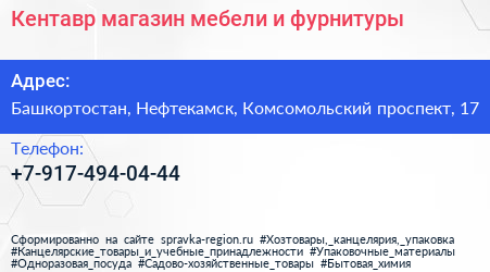 Кентавр, магазин мебели и фурнитуры по адресу Башкортостан, Нефтекамск, Комсомольский проспект, 17 в дальнейшем Организация, размещена в следующих категориях: