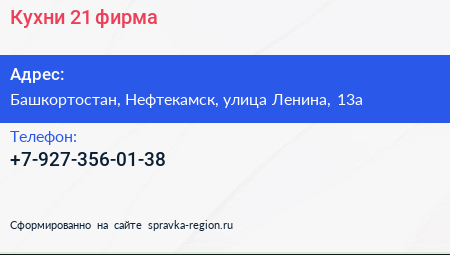 Кухни 21, фирма по адресу Башкортостан, Нефтекамск, улица Ленина, 13а в дальнейшем Организация, размещена в следующих категориях: