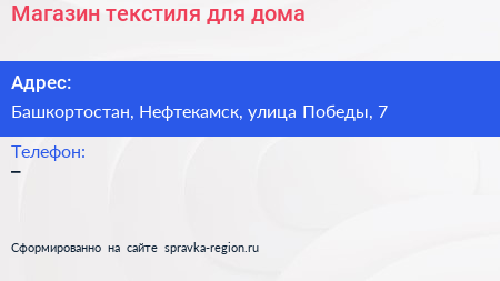 Магазин текстиля для дома по адресу Башкортостан, Нефтекамск, улица Победы, 7 в дальнейшем Организация, размещена в следующих категориях: