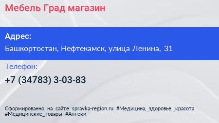 Мебель Град, магазин по адресу Башкортостан, Нефтекамск, улица Ленина, 31 в дальнейшем Организация, размещена в следующих категориях: