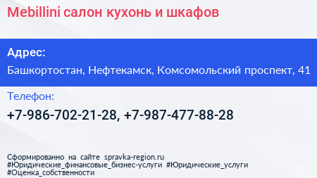 Mebillini, салон кухонь и шкафов по адресу Башкортостан, Нефтекамск, Комсомольский проспект, 41 в дальнейшем Организация, размещена в следующих категориях: