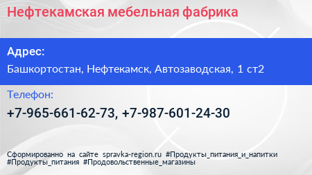 Нефтекамская мебельная фабрика по адресу Башкортостан, Нефтекамск, Автозаводская, 1 ст2 в дальнейшем Организация, размещена в следующих категориях: