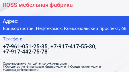 ROSS, мебельная фабрика по адресу Башкортостан, Нефтекамск, Комсомольский проспект, 68 в дальнейшем Организация, размещена в следующих категориях: