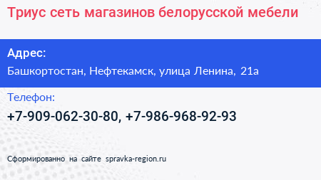 Триус, сеть магазинов белорусской мебели по адресу Башкортостан, Нефтекамск, улица Ленина, 21а в дальнейшем Организация, размещена в следующих категориях: