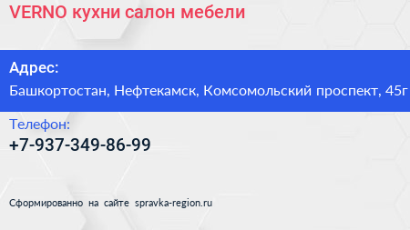 VERNO кухни, салон мебели по адресу Башкортостан, Нефтекамск, Комсомольский проспект, 45г в дальнейшем Организация, размещена в следующих категориях: