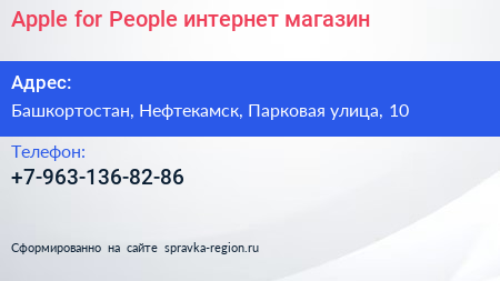 Apple for People, интернет-магазин по адресу Башкортостан, Нефтекамск, Парковая улица, 10 в дальнейшем Организация, размещена в следующих категориях: